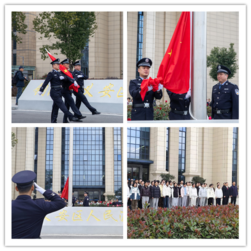 庭审观摩结束后,同学们来到法院大门西广场集合,参加升旗仪式。伴随着雄壮的《义勇军进行曲》,五星红旗冉冉升起,同学们肃立行注目礼,仰望国旗,歌唱国歌,爱国热忱与法治信仰在心中愈发坚定。